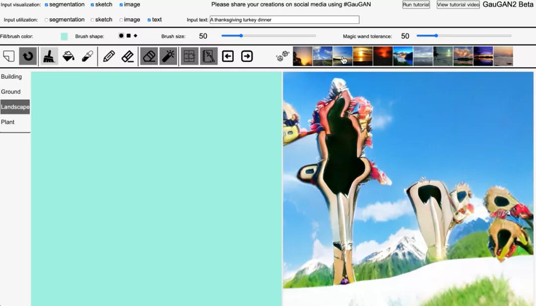 **此外,硅星人還發現,目前GauGAN 2的文本識別好像是隻侷限在建築、土地、景觀和植物這四大類之中。**比如,當我們輸入“一頓感恩節火雞大餐(A Thanksgiving turkey dinner)”時,系統返回的圖像彷彿是什麼外星來物,跟火雞、甚至晚餐根本都不沾邊。