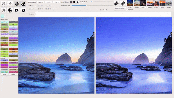 當然,除了通過文本生成之外,GauGAN 2.0同樣也支持1.0版本的使用塗鴉、和導入圖片生成的方式,而且還支持幾種方式的混合使用。