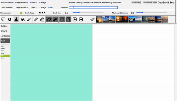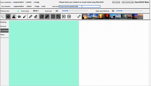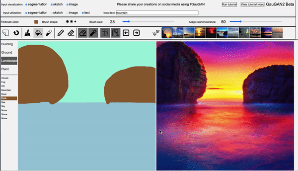 **首先,在文本生成部分,輸入的文本最好都跟自然景觀相關,且形容詞越簡單越好,像大海、湖泊、山、岩石、樹這些關鍵詞都能比較準確返回結果。**在塗鴉部分,儘量不要給畫布留白,比如在畫河流或湖泊時,周邊也要畫上土地或者草地,在塗鴉時也要儘量精細,這樣系統會更容易理解你想要的感覺。