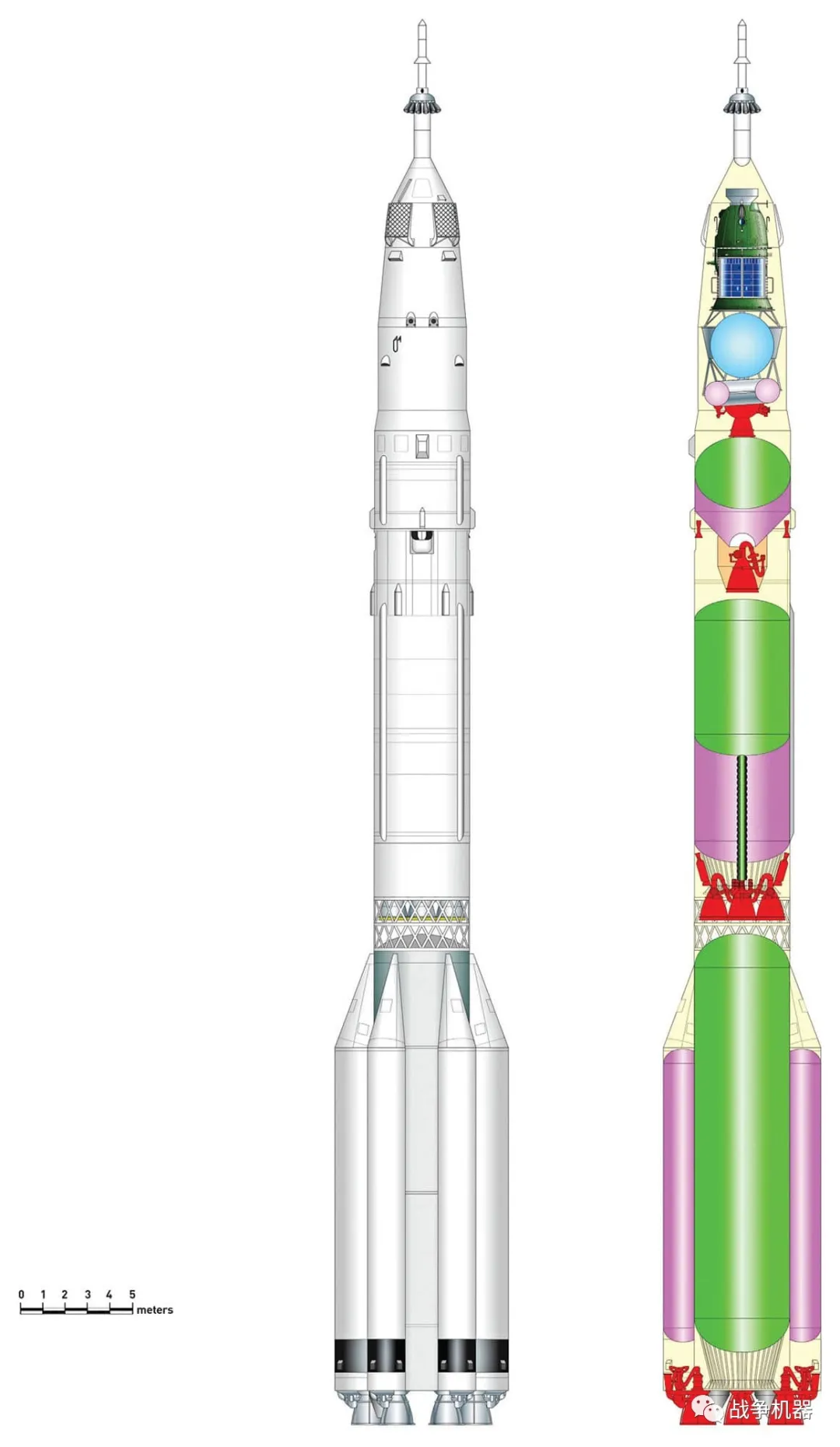 質子(Proton)運載火箭 (8K82K) Zond 4-8(Soyuz 7K-L1) 與聯盟號太空艙的組合佈局