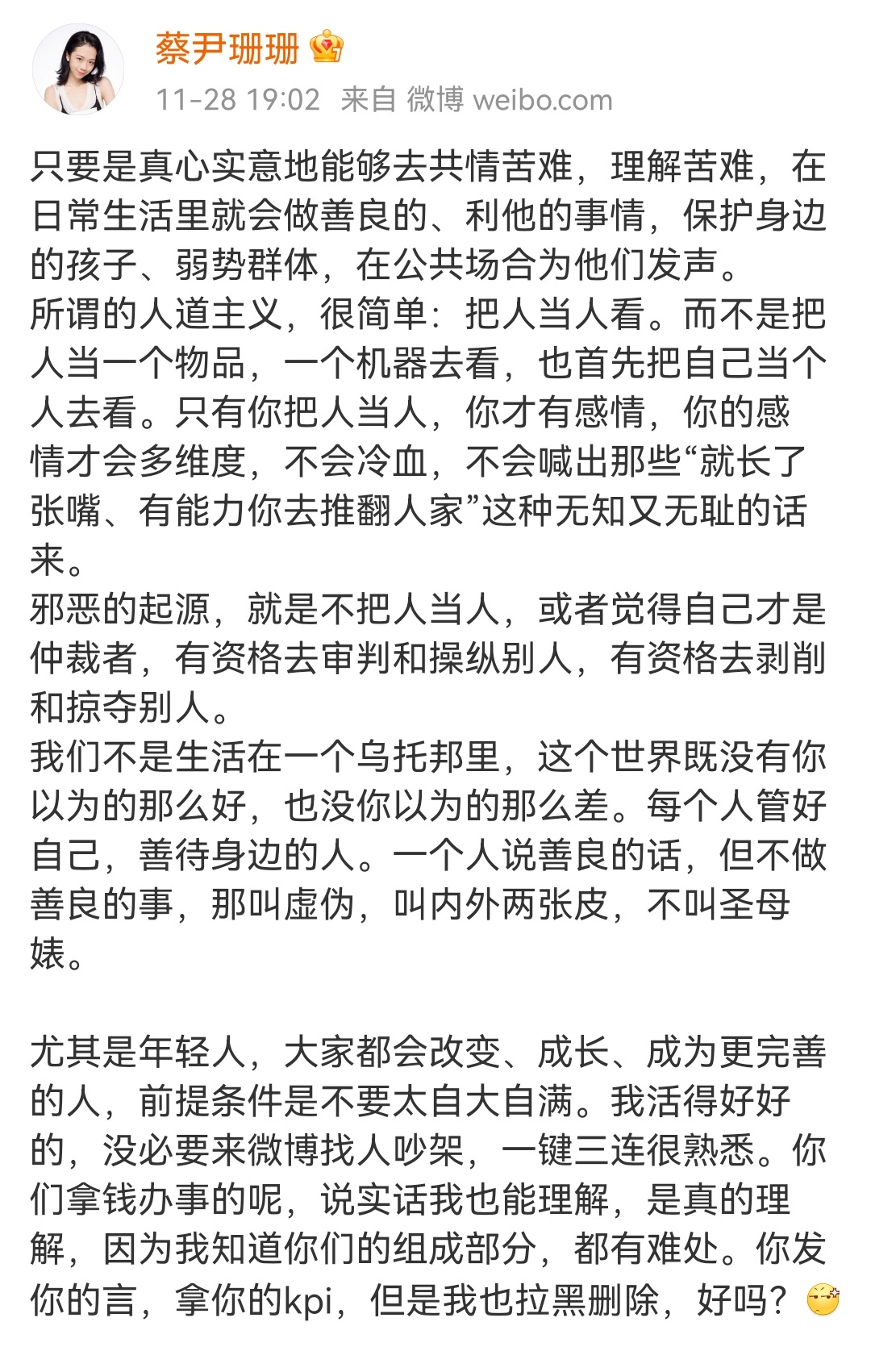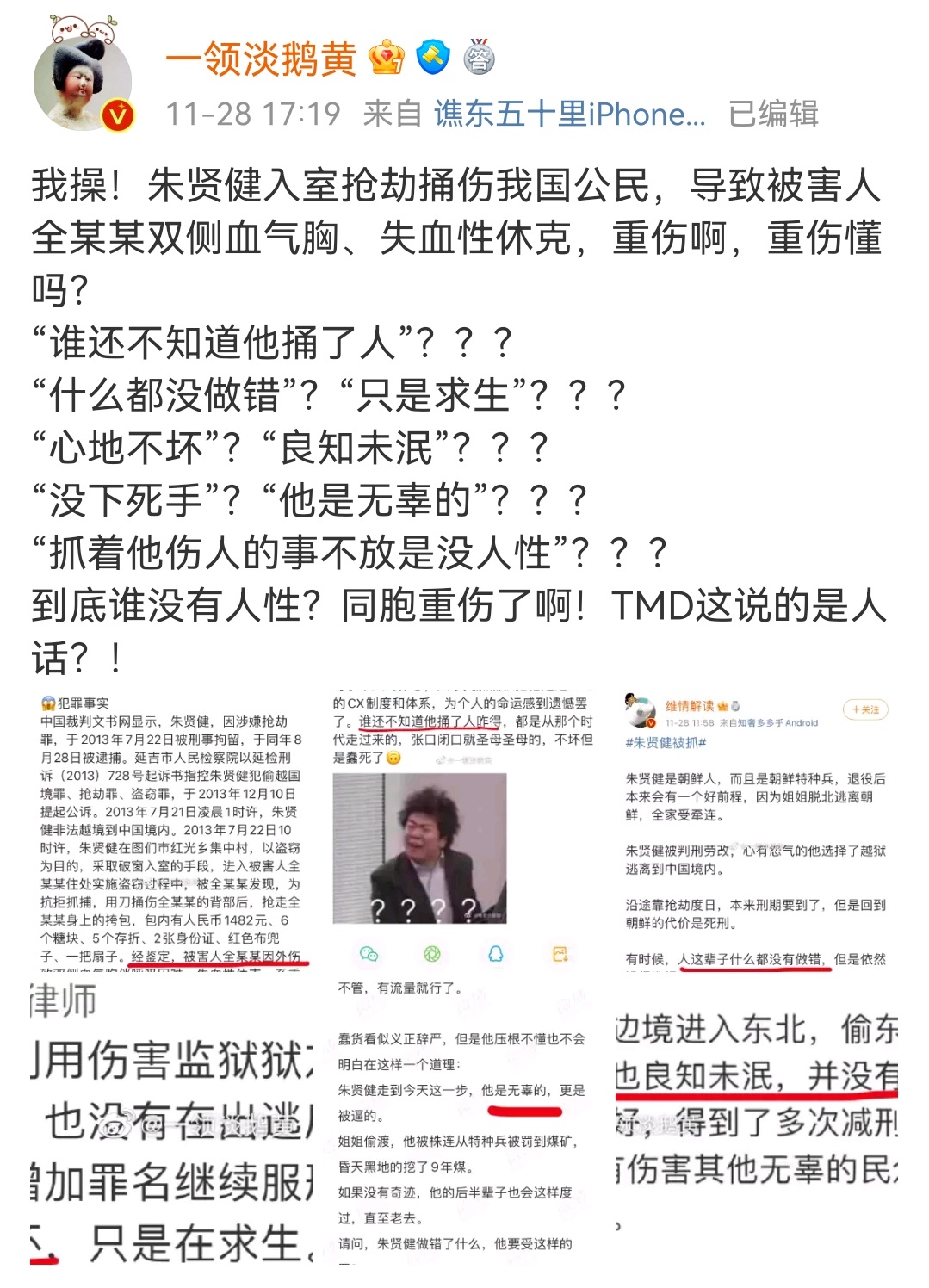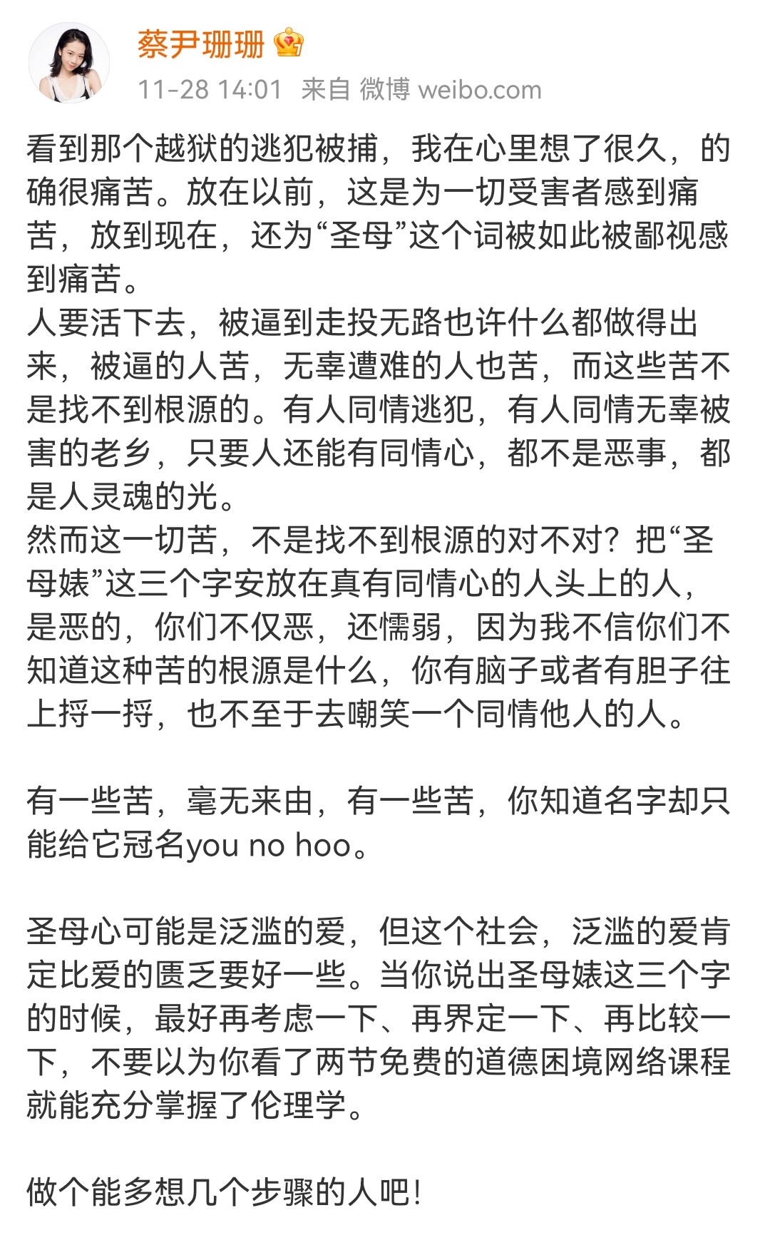 像是上面這個人,@蔡尹珊珊 她説自己為此感到痛苦,説朱賢健是被逼的,他也很苦,“有人同情逃犯,有人同情無辜被害的老鄉,只要人還能有同情心,都不是惡事,都是人靈魂的光”,“聖母心可能是氾濫的愛,但這個社會,氾濫的愛肯定比愛的匱乏要好一些”。