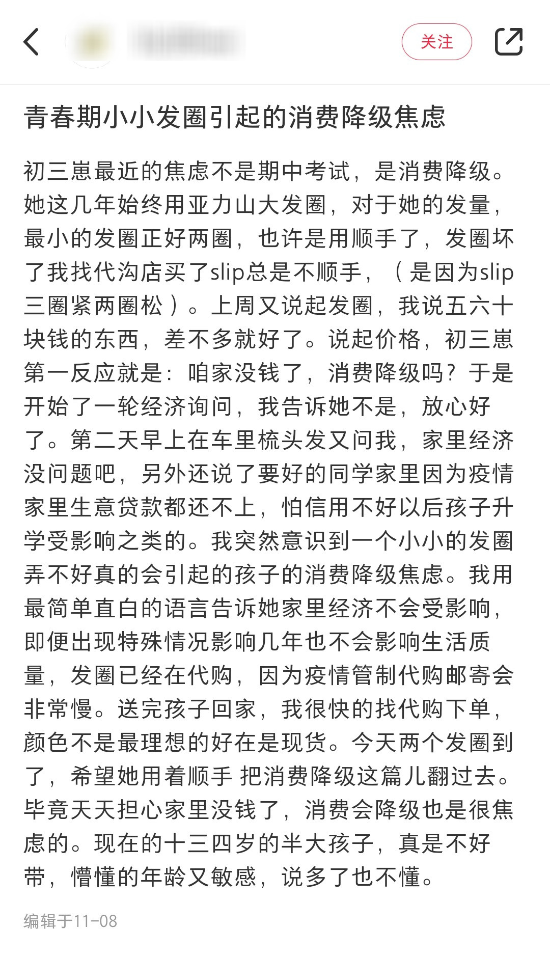 這位媽媽反思:**一個小小的髮圈弄不好真的會引起孩子的消費降級焦慮;現在十三四歲的半大孩子,早熟又敏感,真是不好帶。**她非常耐心地向女兒解釋和保證了,稱家裏的經濟沒有任何問題,即便出現特殊情況,也不會影響到生活質量。