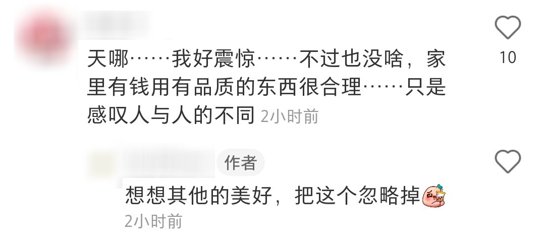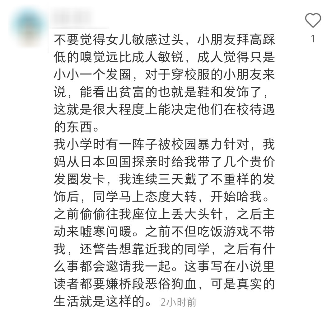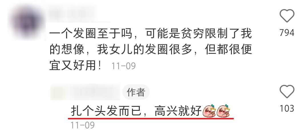 這位媽媽的帖子,引發各種反應。首先是,很多網友看到她女兒用的髮圈都是上百元一個,“一個髮圈至於嗎,可能是貧窮限制了我的想象”,“只能感嘆人與人的不同”。