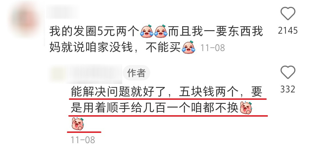 這位媽媽對此回應表示,“五塊錢兩個,要是用着順手,給幾百一個咱都不換”。