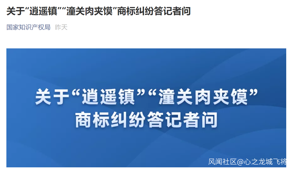 11月26日,國家知識產權局就上述糾紛答記者問時指出,“逍遙鎮”作為普通商標,其註冊人並不能據此收取所謂的“會費”。“潼關肉夾饃”是作為集體商標註冊的地理標誌,其註冊人無權向潼關特定區域外的商户許可使用該地理標誌集體商標並收取加盟費,同時也無權禁止潼關特定區域內的商家正當使用該地理標誌集體商標中的地名。
