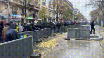 據“今日俄羅斯”報道,這羣黑衣人來自極左翼組織“安提法”。一名巴黎警察在社交媒體上發佈的視頻顯示,黑衣人向警察投擲雜物,還拆除金屬路障襲警,警察則舉盾牌後撤。