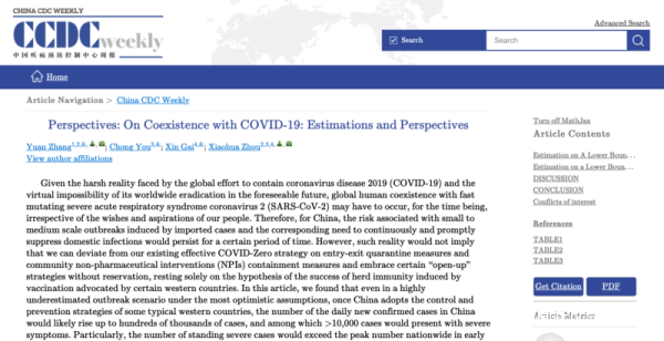 近日,中國疾控中心官方網站刊發了一篇週報,這篇題為《與COVID-19共存:估計和展望》(On Coexistence with COVID-19: Estimations and Perspectives)的文章預測:如果我國採取美國、英國、以色列、西班牙和法國(這5國以下簡稱“參考國”)等西方國家的新冠肺炎疫情防疫策略,我國每天新增感染人數很可能達到數十萬人,其中約1萬例會出現嚴重症狀,這將對我國的醫療體系造成毀滅性的衝擊,在國內造成巨大的災難。