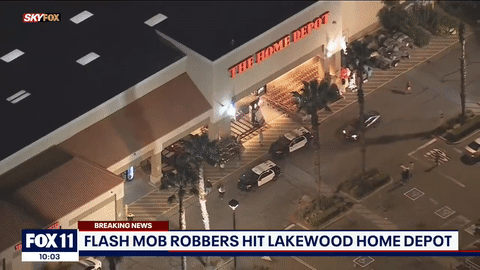 同日晚上,10名15-20歲左右的嫌犯,戴上滑雪面罩衝進洛杉磯Home Depot,搶走了撬棍、木槌和大錘等工具,然後跳上在外面等候的車輛離開。