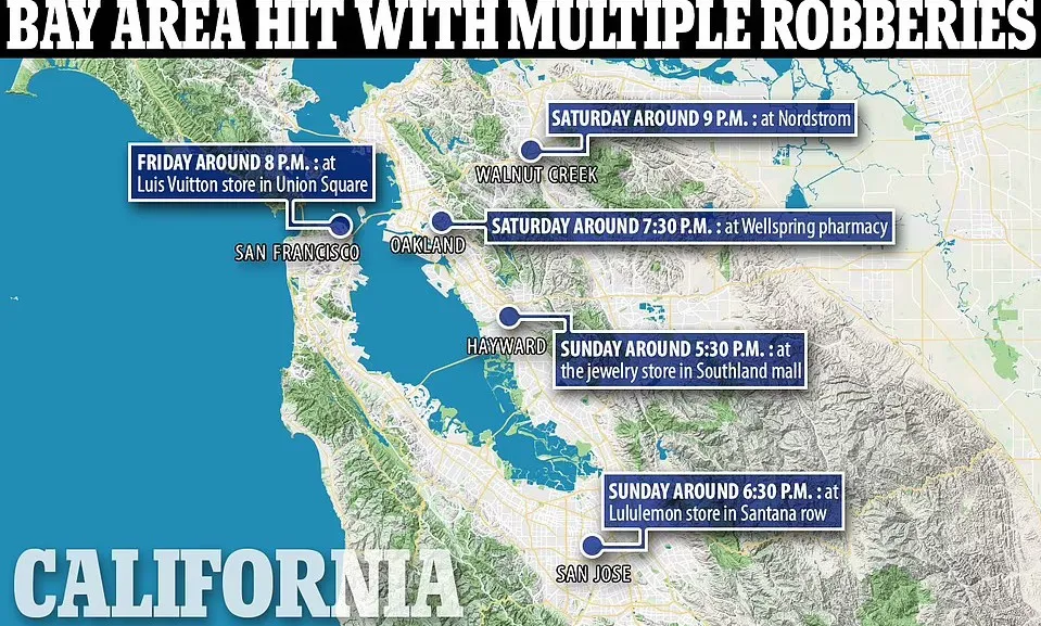 當天晚上,加州灣區Southland Mall裏的Sam’s Jewelers、Macy’s和Lululemon店,又被搶了…