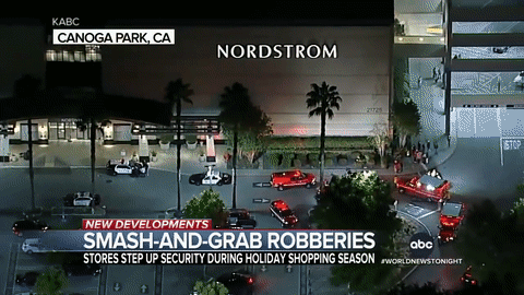 晚上9點左右,80名搶劫者戴着滑雪面罩、拿着撬棍,這夥人在不到一分鐘的時間就洗劫了灣區的Nordstrom商店,偷走了價值20萬美元的名貴商品。