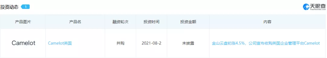 據天眼查APP顯示,金山雲於2021年8月2日對Camelot進行了併購,併購之後金山雲盤初漲4.5%。