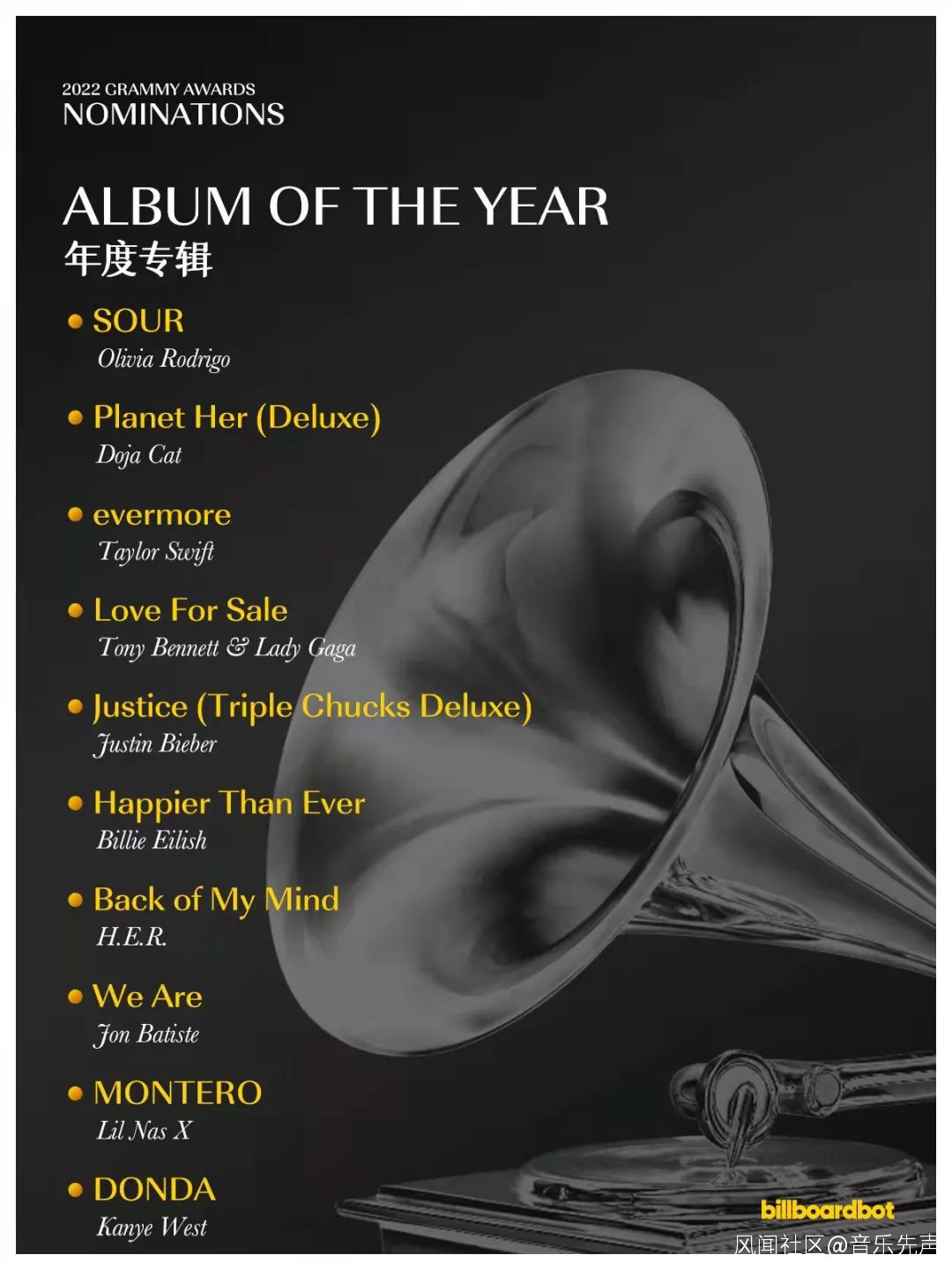 值得一提的是,Taylor Swift本屆格萊美憑藉《evermore》和《SOUR》的歌曲創作署名收穫了2個年度專輯提名,累計6次成為史上獲得最多年度專輯提名的歌手之一;Olivia Rodrigo、FINNEAS本屆格萊美均獲得四大通類獎項提名;Selena Gomez、ABBA等藝人收穫了生涯首次格萊美提名。