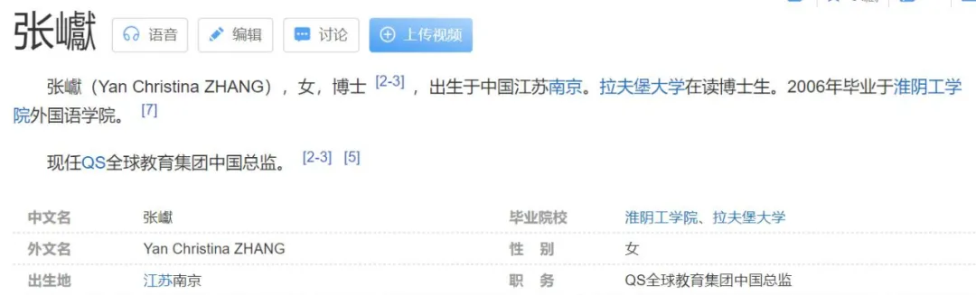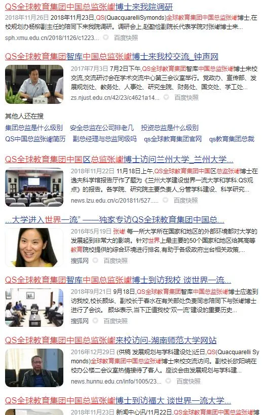 現任QS全球教育集團中國總監張巘(Yan Christina ZHANG),2006年畢業於2000年從專科升為二本的淮陰工學院外國語學院。後進入英國拉夫堡大學讀碩士。目前網上展示的個人資料為“在讀博士”。英雄可以不問出處,但在科學和學術上無任何成就、來自三流甚至四流大學的學生,現在居然成為中國“雙一流”建設戰略發展方向上,其實際影響力不亞於中國教育部長的人,頻頻成為中國各個大學負責人的座上賓,並全面指導中國如何建設世界一流大學。這怎麼可能是正常的事情?