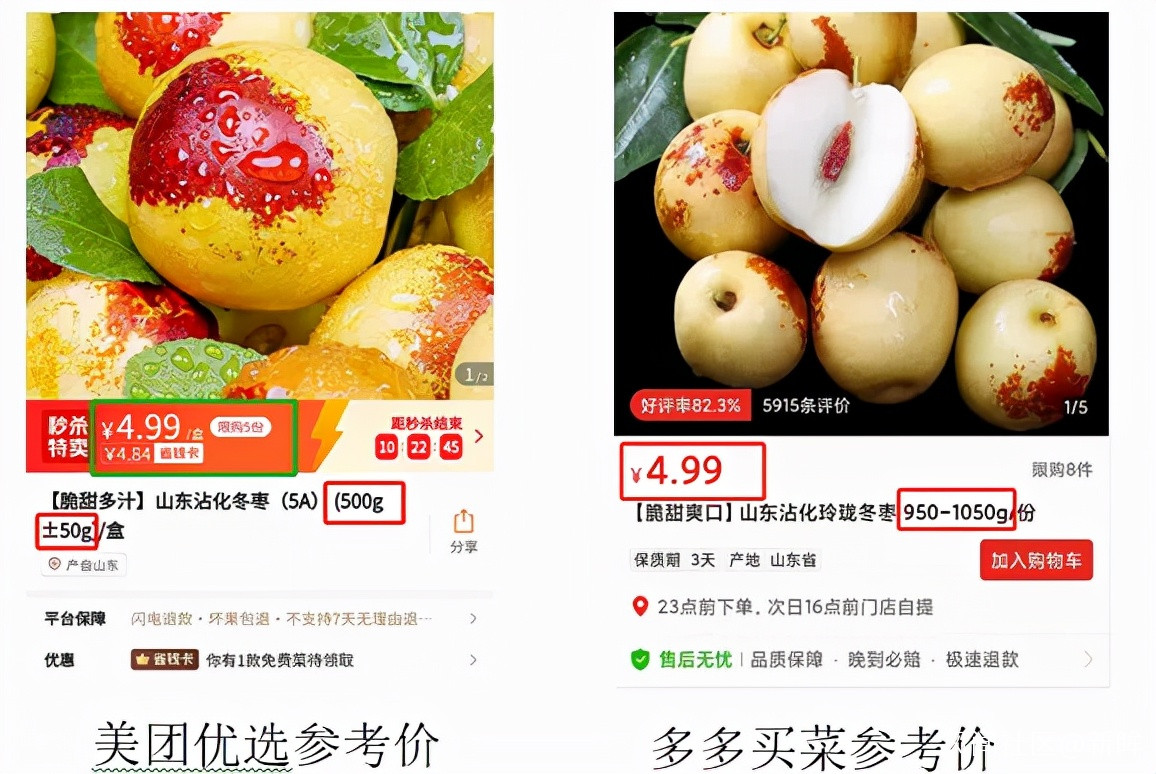 打開應用,標紅標粗的價格直接映入消費者眼簾,所謂的低價策略也可能是商家在“玩花樣”,以山東沾化大棗為例,在美團優選和多多買菜上定價相同,均為4.99元/份,消費者通常會默認兩者同價、同量,殊不知商品重量同樣是需要關注的重點。