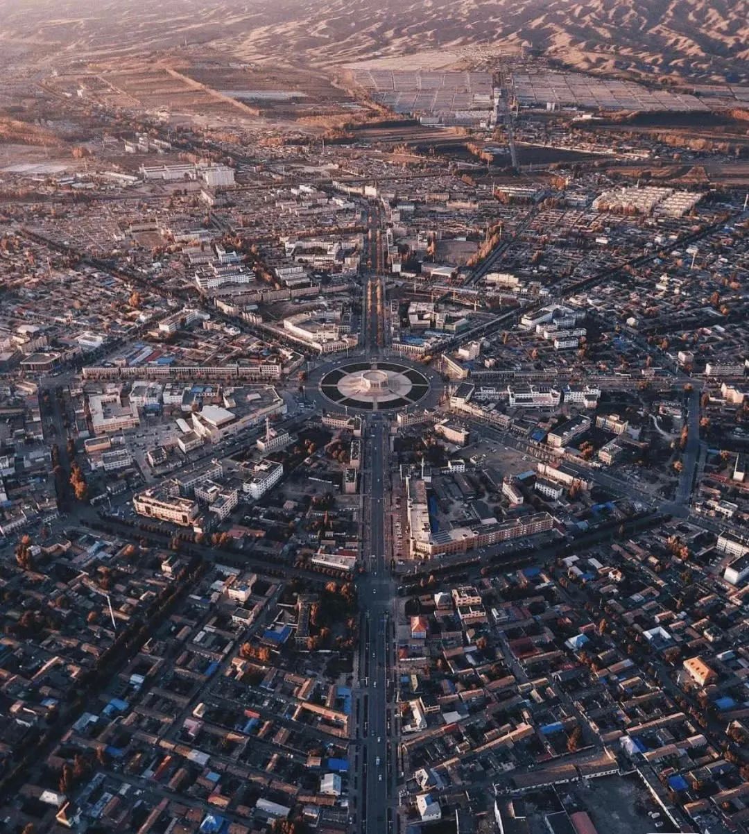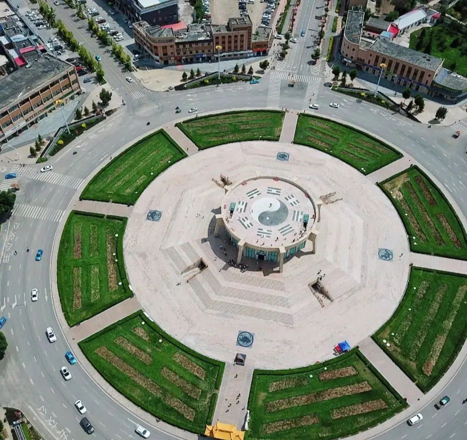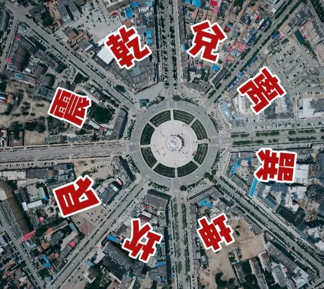 以城中心的太極壇作為陰陽兩極,按照後天八卦圖的佈局,向外延伸乾、坤、震、巽、坎、離、艮、兑八條大街,一幅巨大的八卦圖在山谷鋪開,穿梭在特克斯的大街小巷。