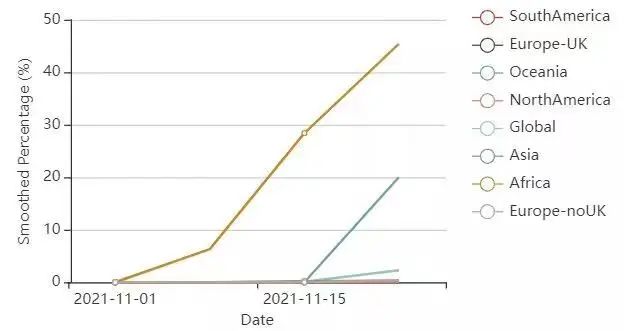 僅僅3天后,博茨瓦納的鄰國南非,也發現了攜帶同樣突變的變異毒株,而且重點在於,南非相關研究機構發現,攜帶有最新突變的變異株在檢測出來的感染樣本中的比例,直線上升。