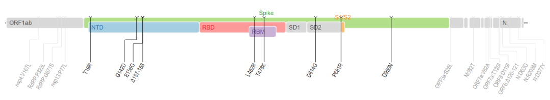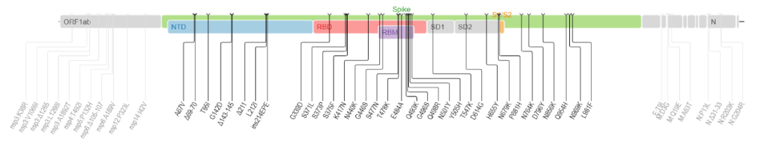 *Omicron(上)和delta(下)的突變分佈圖,顯示Omicron變異株存在大量突變,是目前為止突變分佈最分散的變異株,而且變異大多位於與人體細胞相互作用的地方。