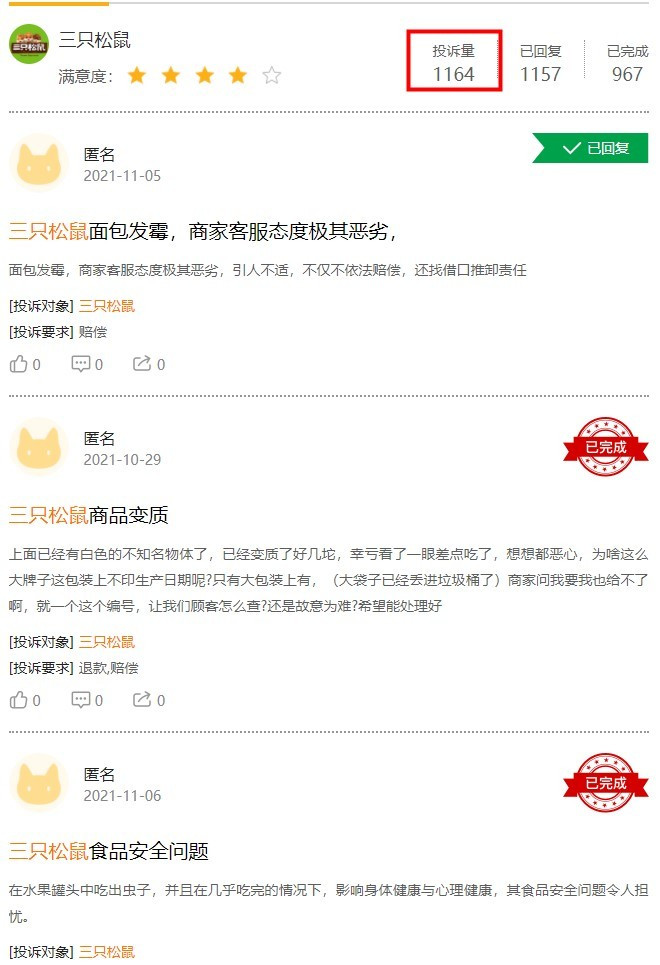 黑貓投訴平台上,關於三隻松鼠的投訴量一共有1164條,發黴、有蟲子、有蟲卵等問題比比皆是。