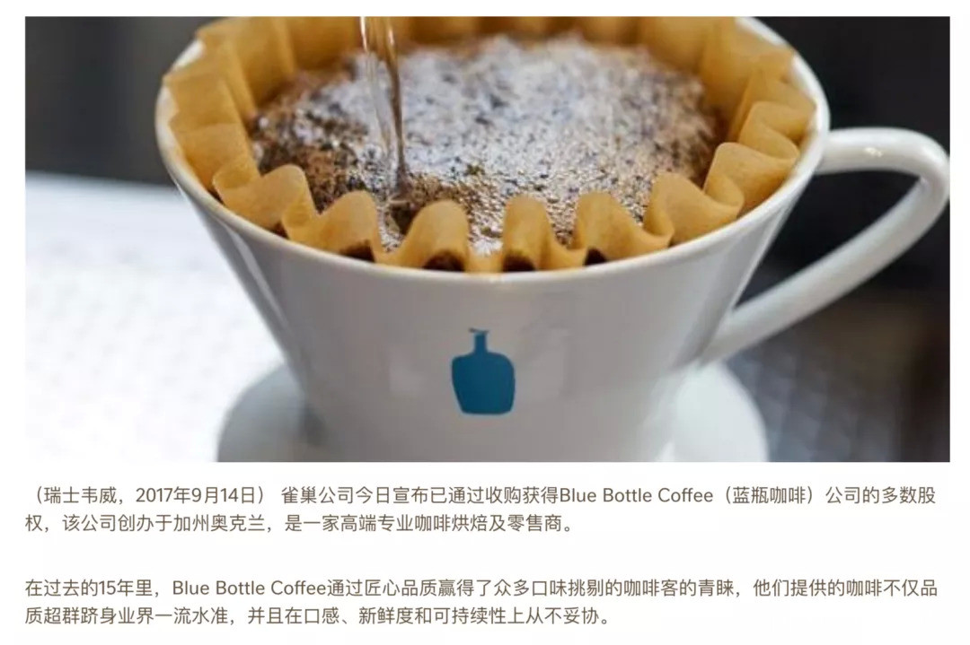 在2017年9月,雀巢宣佈斥資約4.25億美元收購Blue Bottle 68%的股份,而Blue Bottle繼續作為一個獨立的實體運營。