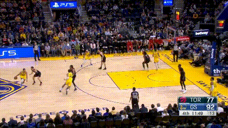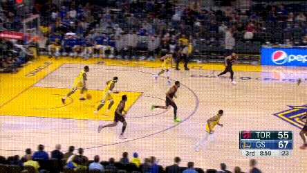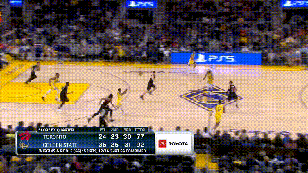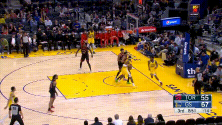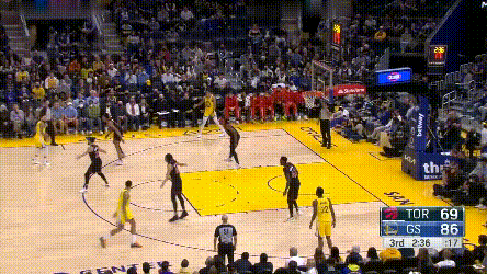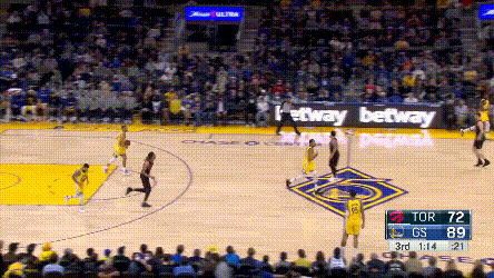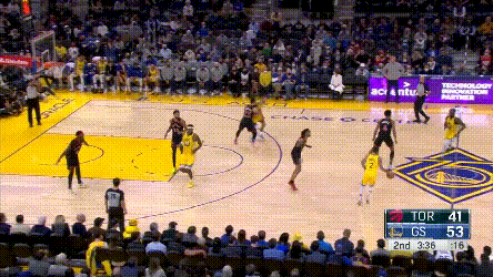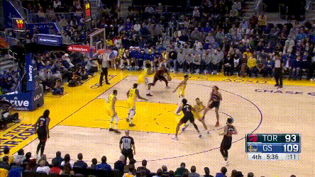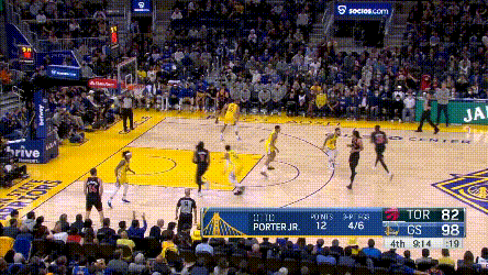 庫裏倒是不累,猛龍對他的過度忌憚,讓他成了真正的“站曼巴”,他能用最簡單的方式製造威脅,其他就看隊友打就行了——你看,庫裏連屏幕都不用進入了。