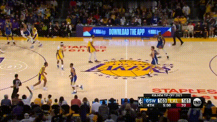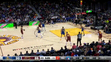 庫裏給隊友作掩護,其實並不侷限於戰術設計,掩護意識已經成了自然而然的習慣。比如,攻防轉換途中,給維金斯順勢做了掩護。之後站在三分線外兩米——帶着範弗利特暢聊人生。
