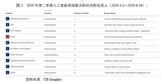 美國依然是全球人工智能創業熱土,但中國緊隨其後。2020年第二季度, 美國繼續佔據AI創業公司交易份額的主導地位。根據CB Insights 的統計,2020年第二季度,全球創業公司交易 份額累計72.273億美元,其中美國佔39.5%,中國緊隨其後,佔15.5%。圖2是2020年第二季度全球人工智能領域最活躍的風險投資人排名,前10名均來自美國。美國依然是人工智能創業最活躍和最吸引相關風投的地區。