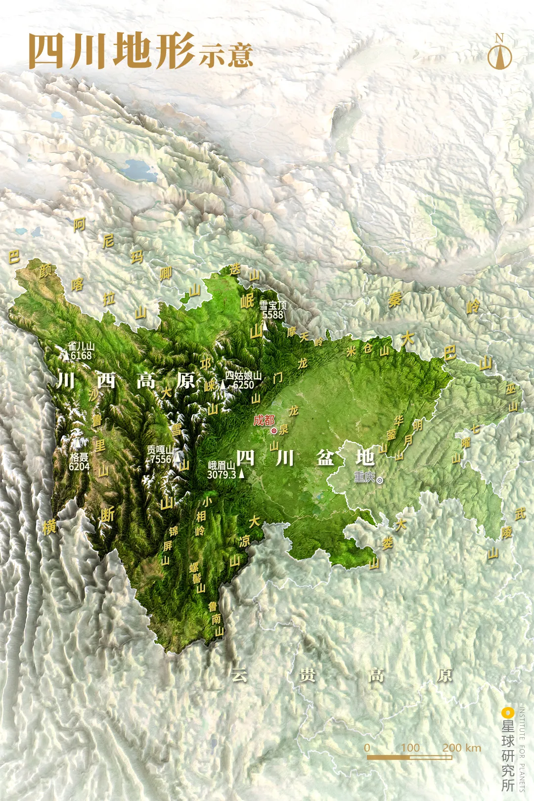 (四川地形示意,為顯示四川盆地完整性,對重慶部分做了淺着色處理;製圖@陳志浩/星球研究所)