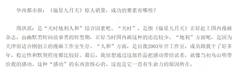 十年前,在華西都市報的採訪中,當被問及《偷星九月天》的成功原因時,周洪濱本人是這樣解釋的:“天時地利人和”,成功的要因全看命。