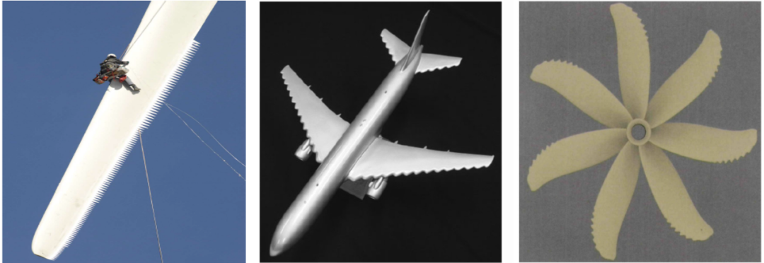 受貓頭鷹安靜飛行的啓發,研究人員通過在流體部件上安裝齒狀前緣與尾緣來降低其氣動噪聲。齒狀前緣可以降低由於湍流入流與前緣作用所產生的前緣噪聲,而齒狀尾緣則可以降低由於邊界層與尾緣相互作用產生的尾緣噪聲。近些年,鋸齒尾緣也逐漸應用在風電葉片上,通過測量發現在葉片尾緣安裝鋸齒可以獲得3.2分貝的降噪效果。