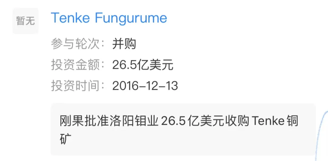 2017 年的時候,洛陽鉬業曾經尋求合作伙伴,想收購加拿大倫丁礦業在 TFM 的股份,這時候渤海華美介入,為這次交易募集了 11.4 億美元,並且和洛陽鉬業簽署了協議,允許洛陽鉬業收購渤海華美在 TFM 的股份。