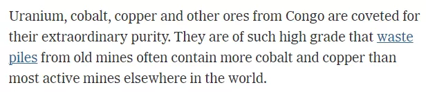 更厲害的是,剛果的礦石純度非常高,據説有的老礦山的廢料堆都比其他國家大多數活躍礦山的鈷和銅含量更高。