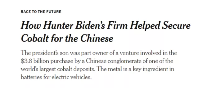 NYT 看起來似乎比美國政府還要急,最近報道了這個事兒之後,還發了另外一篇報道,標題是《 亨特 · 拜登的公司如何幫助中國人獲得鈷 》。