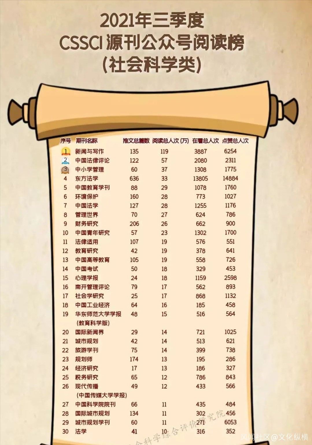 在媒體融合發展趨勢下,學術期刊積極探索媒體融合傳播的新型出版模式,通過建設微信公眾號以擴展內容傳播渠道,提升學術期刊傳播力、影響力。中國人文社會科學綜合評價研究院以CSSCI中文社會科學引文索引數據庫(2021-2022)收錄的814種學術期刊為樣本(30種台灣地區期刊因無法採集微信公眾號,本次研究暫未統計),通過公開渠道全面採集了2021年第3季度學術期刊微信公眾號的相關數據。以下為綜合性社會科學和高校學報類、人文學科類、社會科學類的第三季度**TOP30學術期刊微信公眾號(以閲讀總人次排序),**數據由“中國人文社會科學綜合評價研究院”公眾號發佈。