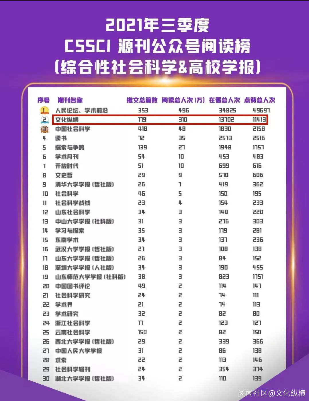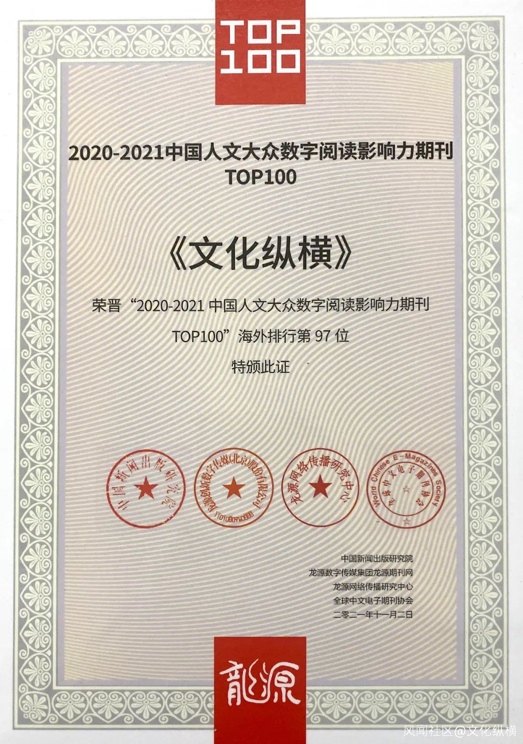 在2020-2021中國人文大眾數字閲讀影響力期刊TOP100評選中,《文化縱橫》榮晉**“2020-2021中國人文大眾數字閲讀影響力期刊TOP100”海外排行第97位,為唯一入選的學術期刊。**自2019年起,《文化縱橫》與龍源期刊網合作開發海外市場電子刊閲讀,主要用户為海外高校圖書館及公共圖書館領域。在此,由衷感謝社會各界人士長期以來給予《文化縱橫》莫大的信任和支持。