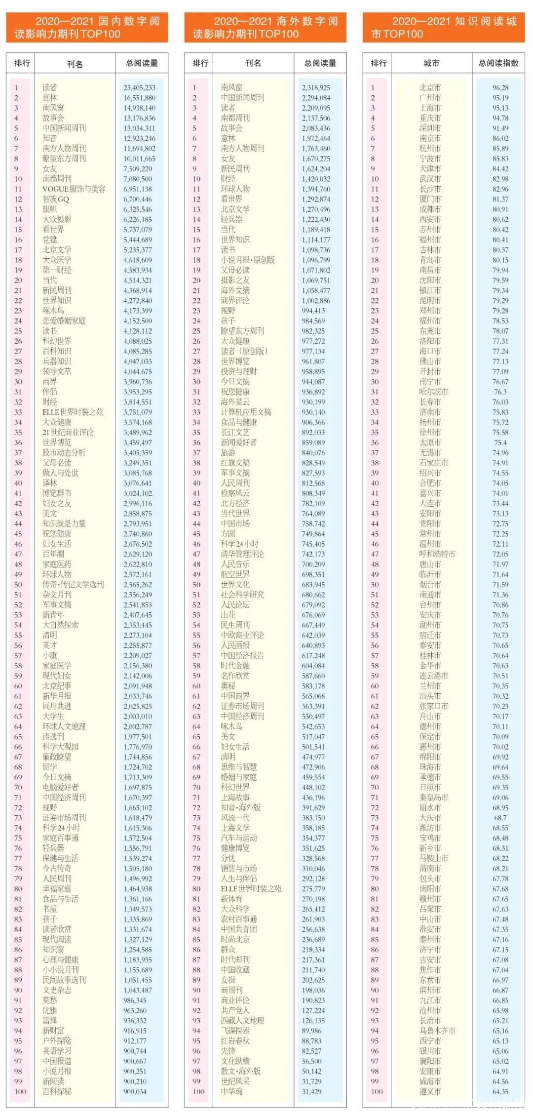 2021年10 月 28 日,中國新聞出版研究院和龍源數字傳媒集團在中國數字出版博覽會上聯合發佈 2020—2021 數字閲讀影響力期刊 TOP 100 和 2020—2021 知識閲讀城市 TOP100 排行榜,詳情如下(本圖原刊於《中國新聞出版廣電報》):