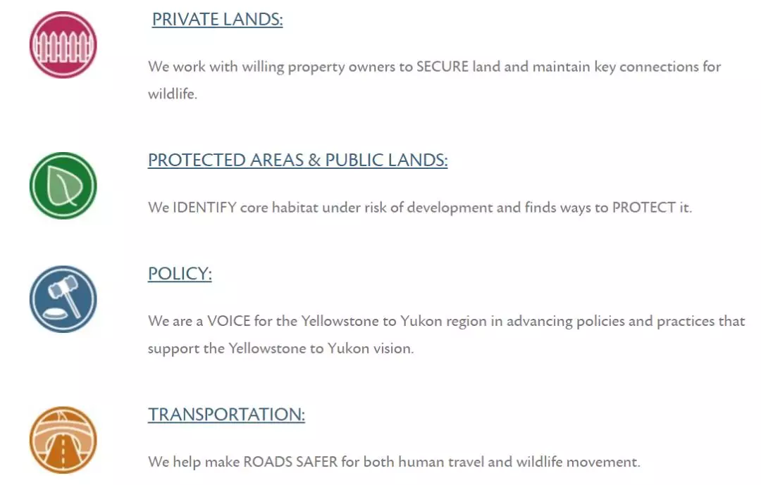 “黃石至育空保護倡議(Yellowstone to Yukon Conservation Initiative,簡稱Y2Y)” 是一個有20年曆史的非營利組織。它有一個偉大的目標,希望創造一條從美國到加拿大的生態廊道,將黃石國家公園到育空的碎片棲息地連接起來並加以保護,使人和野生動物能夠共存。