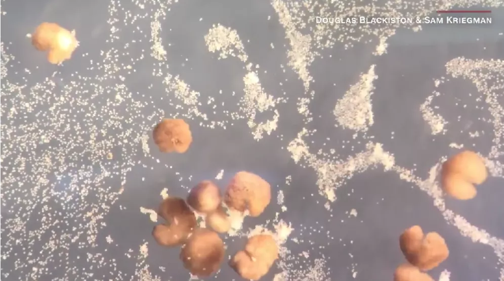 研究人員發現,如果將足夠多的異種機器人放置在培養皿中彼此靠近,它們會聚集並開始將其他漂浮在溶液中的單個幹細胞堆疊起來。於是,多達數百個幹細胞在它們如同吃豆人形狀的“嘴”中組裝了“嬰兒”異種機器人。