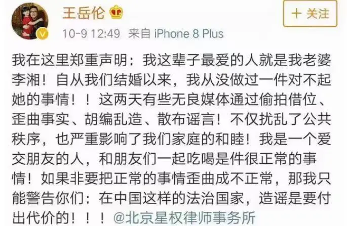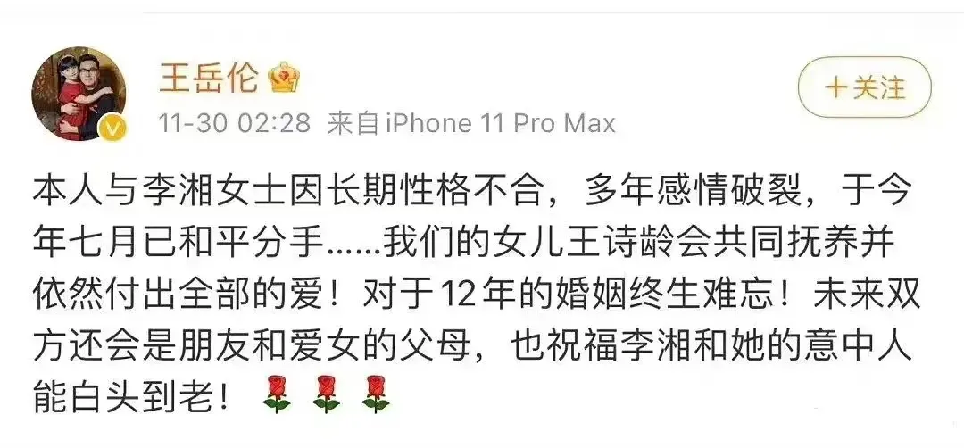 而最神奇的是,王嶽倫的離婚聲明都是內涵。最後一句,就是説雖然本人長期出軌,但李湘也沒閒着的意思咯。
