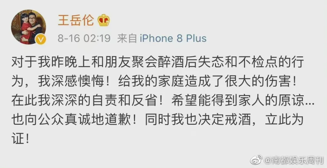 但之後發出聲明,他説自己只是喝完酒失態了。