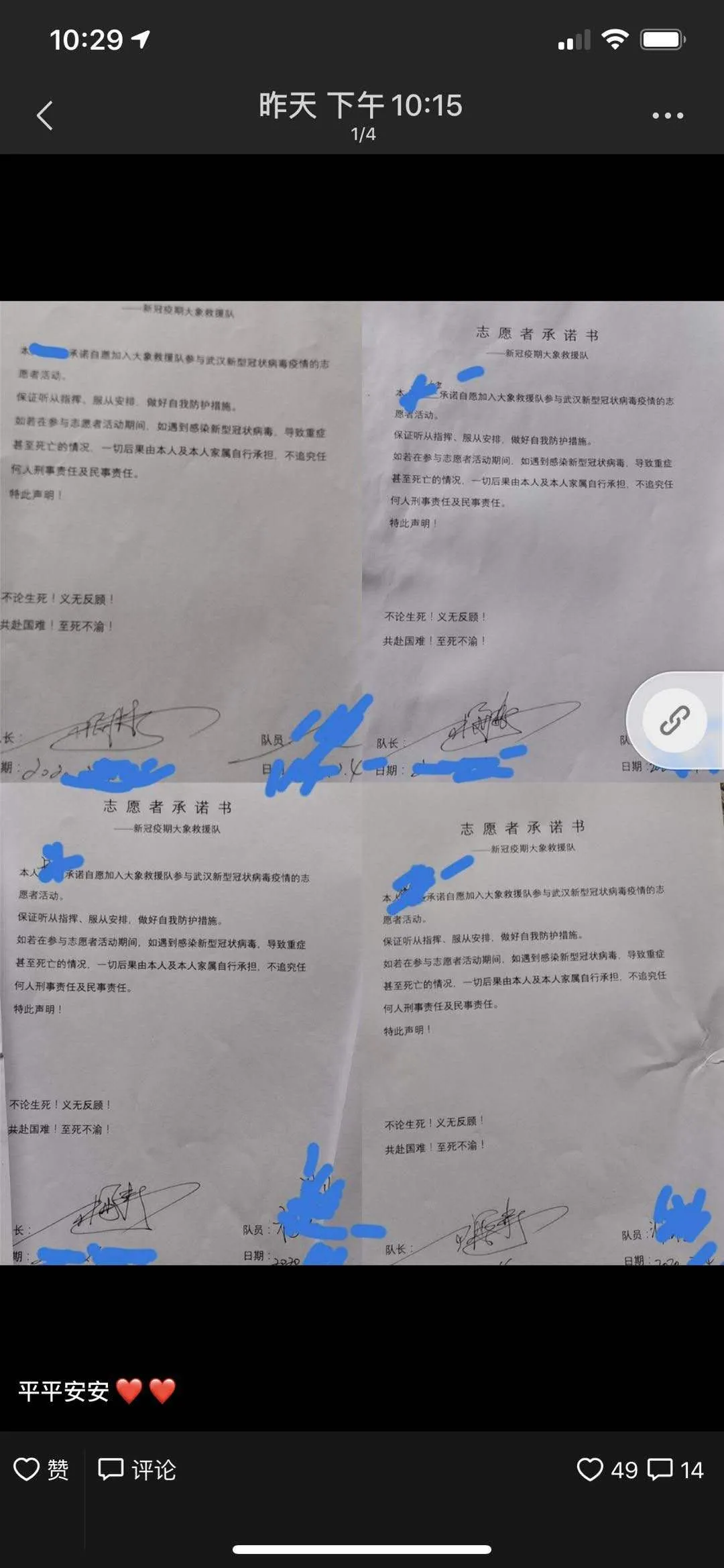 志願者之間,自然而然地根據需求形成了一些分工,比如有人接送醫護人員,有人負責尋找和運送抗疫物資,也有人提供病患和志願者的心理疏導服務。當時團隊籤的“志願者承諾書”,現在被湖北省博物館收藏了。