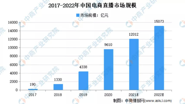 2020年,市場規模相較於上年增長121%,達9610億元。中商產業研究院預計,2022年中國電商直播市場規模進一步上升至1.5萬億元。