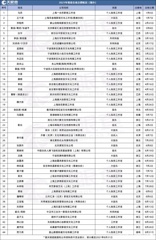 據統計,75位一線藝人相關公司共有647家,其中註銷200家,7成公司存活不足3年。