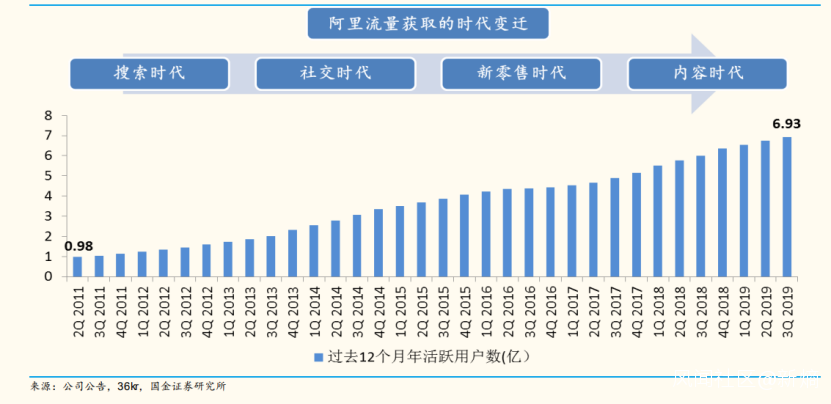 從2011年到2019年,阿里流量獲取先後度過四個時代變遷。在搜索時代,阿里通過早期電商紅利,藉助在電商供應鏈、物流等基礎設施的優勢,封鎖百度外鏈,使淘寶成為電商流量入口。