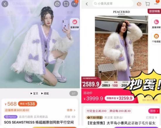 最近站出來指控太平鳥抄襲的是一家小眾原創服裝品牌,品牌名叫“SOS_SEAMSTRESS”。10月25日,SOS發文控訴:太平鳥1:1抄襲自家某一款服裝,除了把灘羊毛改成貉子毛外,版型、顏色,甚至紐扣、蝴蝶結裝飾的位置都一模一樣,該話題很快登上微博熱搜。