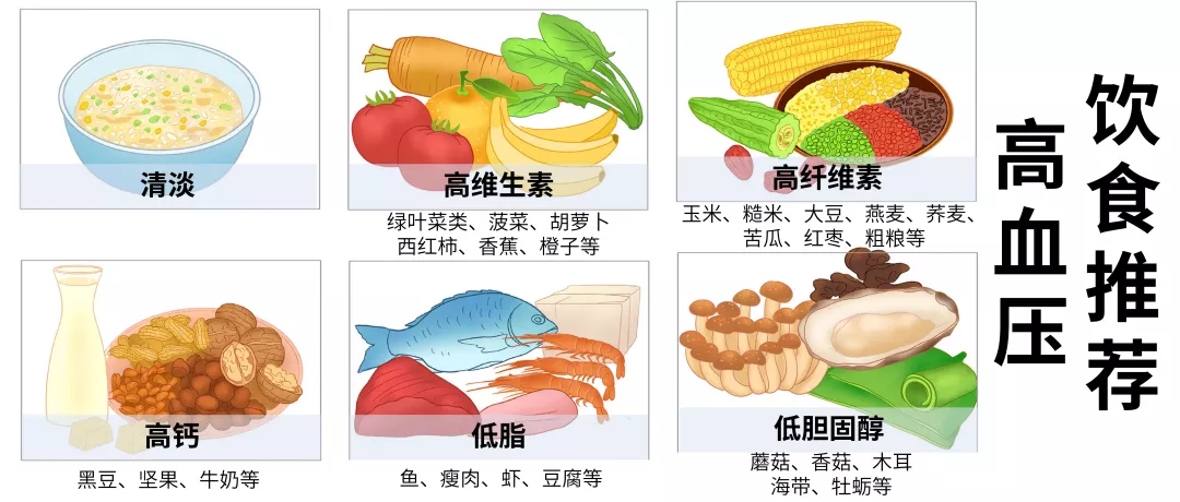 菠菜、捲心菜、西紅柿等新鮮蔬菜;香蕉、豆類、菌菇等含鉀食物;粗糧、燕麥等全穀物;魚肉、適量堅果等優質蛋白和脂肪。