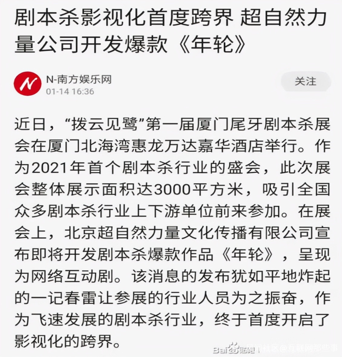 在今年舉辦的首屆廈門市尾牙劇本殺展銷會上,北京超自然力量文化傳播有限公司挑中了劇本殺圈子裏的一款現象級的經典劇本《年輪》,稱即將把這個爆款劇本殺遊戲的劇本改編為網劇,通過互動劇的形式,邁出了劇本殺走向影視化的第一步。