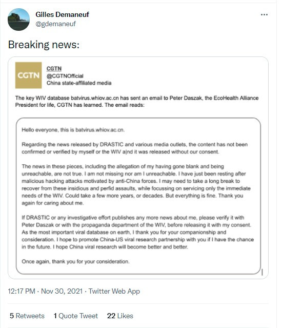 這是一個很有意思和具有迷惑性的觀點,雖然這些成員被描述為一羣鬆散的互聯網活動家,顯然這來自於2020年主流學界的稱呼,在2021年拜登重新調查新冠起源卻一無所獲的時候,DRASTIC利用了這點,他們找到了一個廢棄的DARPA文件,來自**“生態健康聯盟”和“內部信件”,所有的證據鏈指向了一個更加聳人聽聞的結論:“自2013年以來,生態健康聯盟的主席彼得達薩克通過向美國國立衞生研究院NIH或美國國際開發署獲取資金支持以對新冠這類病毒進行功能增益研究,而新冠病毒並不是單一從中國的蝙蝠,而是在緬甸、馬來西亞等東南亞多地的美國機構將蝙蝠病毒送到武漢研究所,由於設備和人員的疏漏最終導致病毒的泄露”。**這導致了新冠調查組織的解散。