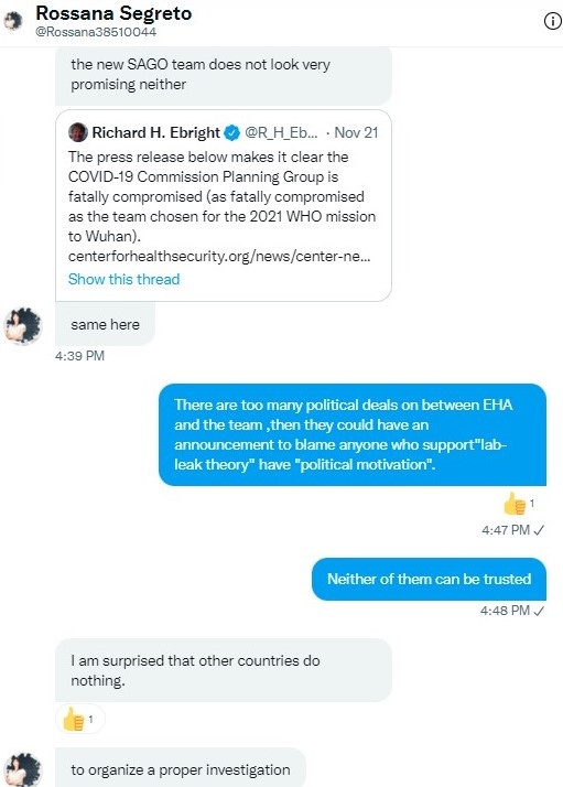 很有意思的是RASTIC成員聲稱收到了政治的干涉,來自美國現任政府、首席衞生官員安東尼福奇以及所謂的“來自中國的壓力”,小組成員Rossana顯然對近期新成立的溯源調查組織SAGO也充滿了不信任。
