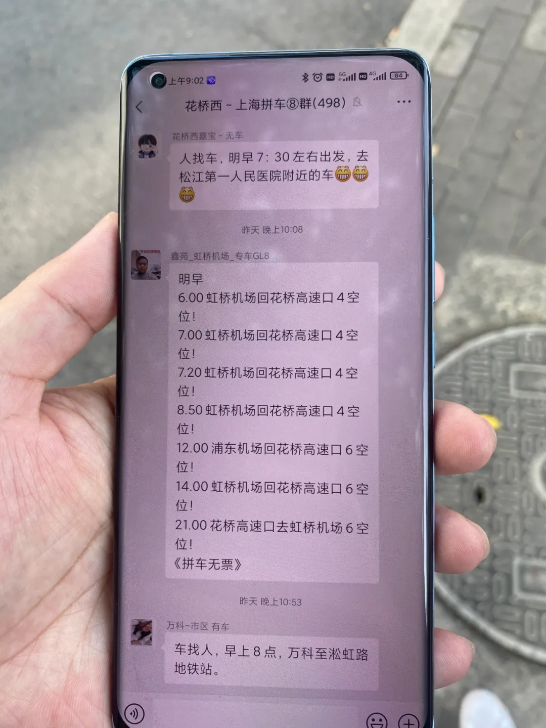 八點半出發到虹橋剛剛好,即便是晚幾分鐘到,多加會班也沒有太多影響,着急的話偶爾打個車,因此他手機有各種各樣的拼車羣