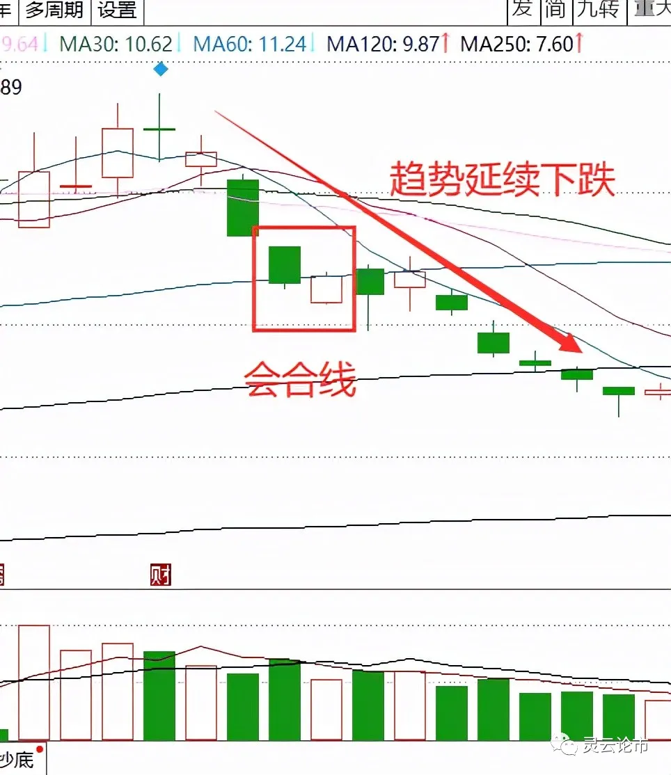這裏需要注意,在下跌趨勢中,先陰後陽是會合線,先陽後陰是分離線。和上漲趨勢正好相對。但是含義均是:趨勢的延續。